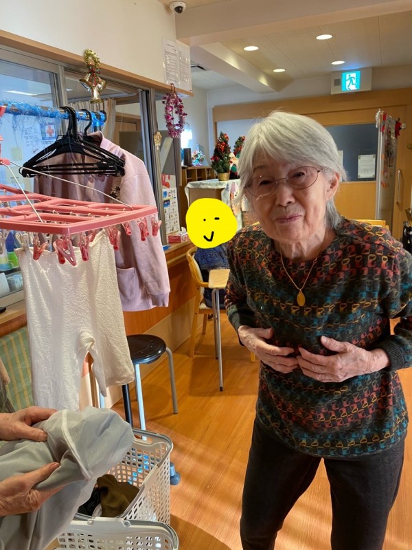 毎朝、おやつの後に洗濯物干しのお手伝いをして頂いてます。