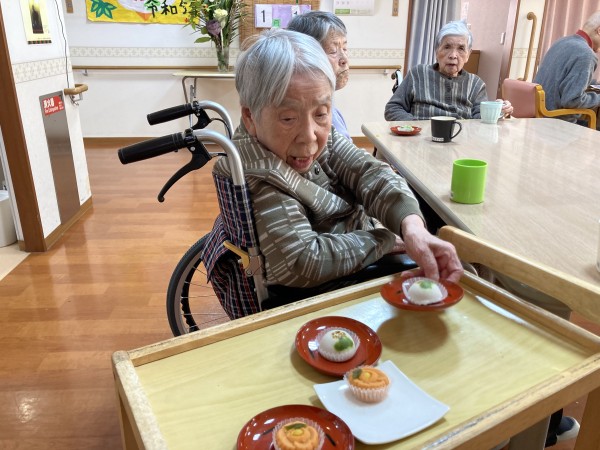 おやつは数種類の和菓子の中から利用者様に選んでもらいました。