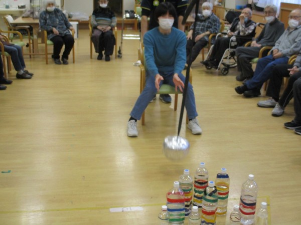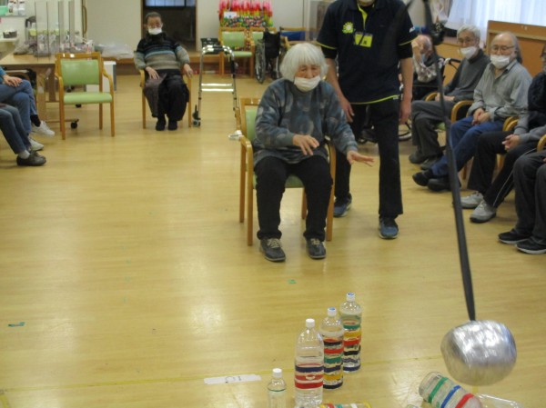 今日の運動レクリエーションは『空中ボーリング』です!