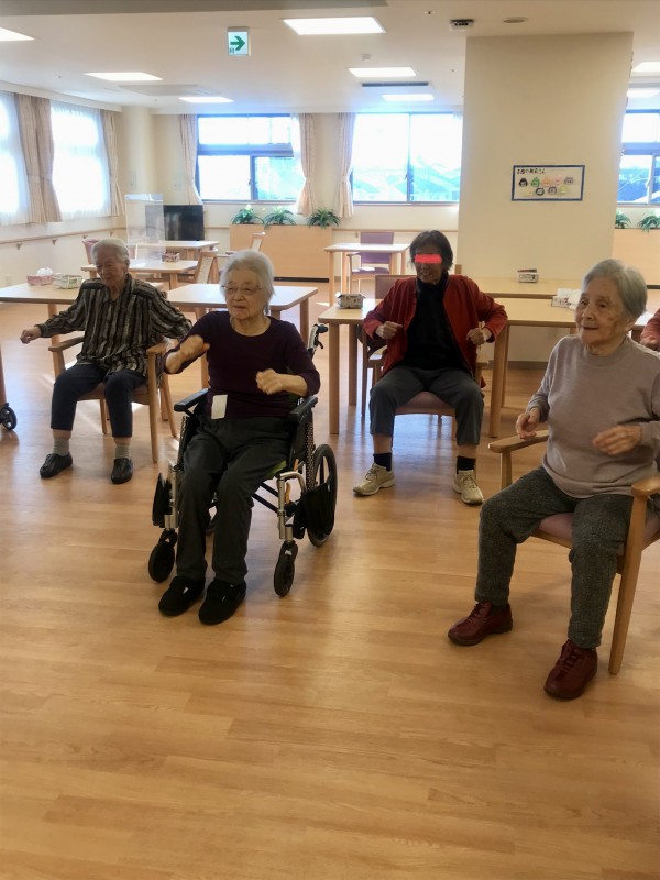 体だけでなく、口も頭も使いながらの体操は脳が活性化されてご利用者様にとって良い効果があるとのこと!