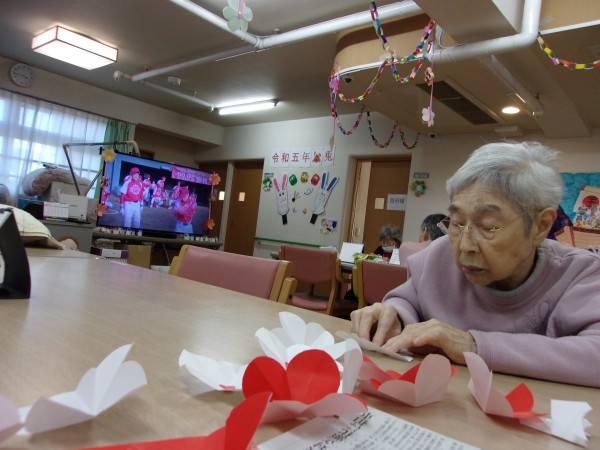 午後のレクリエーションで、梅の花、うぐいすを皆様に作って頂きました(^o^)丿