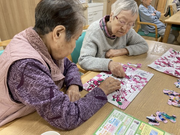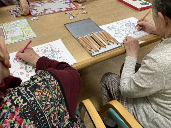 各フロアでは、2月の飾り作りや塗り絵、パズル等それぞれ楽しまれています。