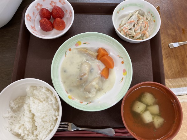 1月22日の昼食はクリームシチューとデザートの苺でした(●´ω`●)