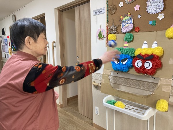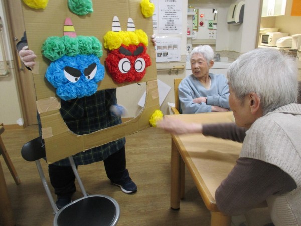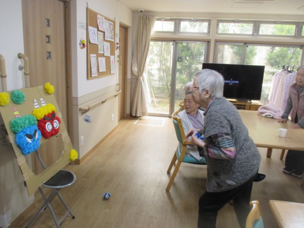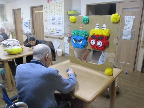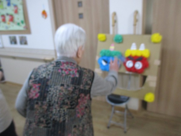 鬼の顔と口をめがけて紙の玉を投げていただきました。