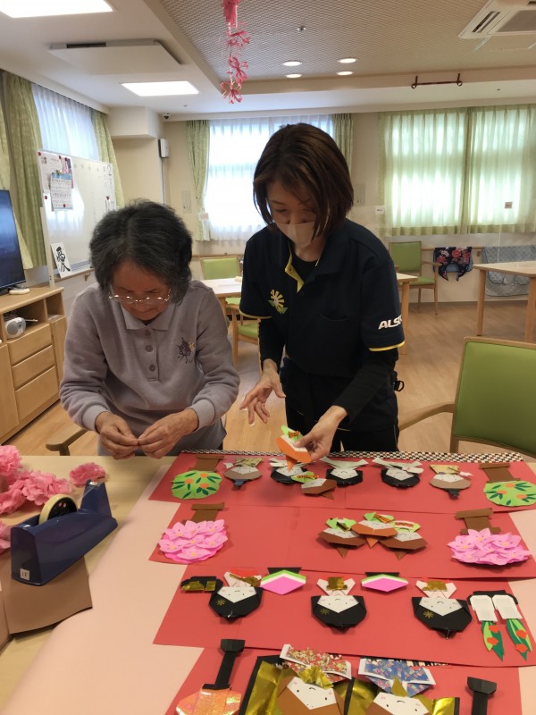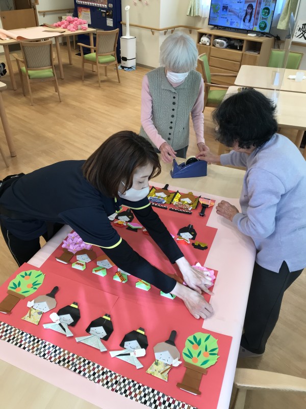 お次は、あらかじめ折紙で制作したお雛様を貼り付ける場所を確認していきます