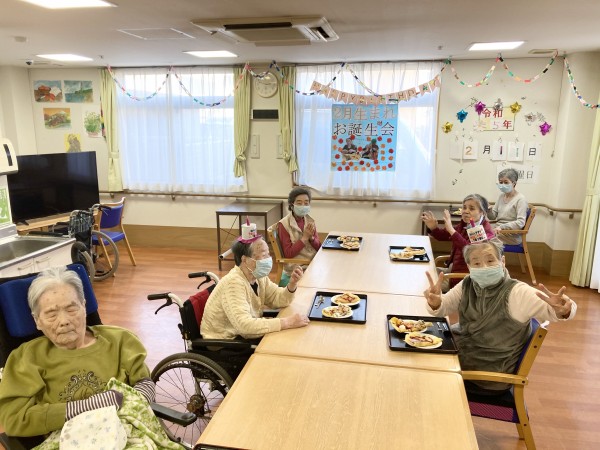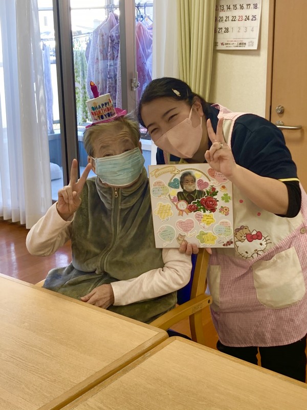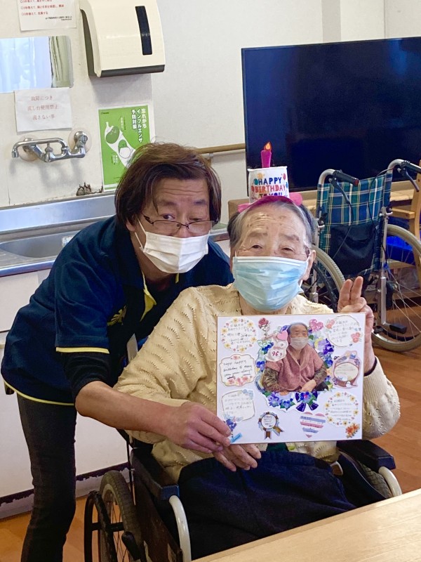 1階のご入居者様と一緒にお祝いの歌を歌って集合写真を撮りました(*^^*)
