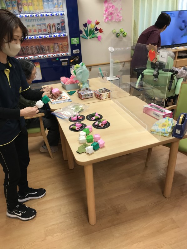 先日おやつレク等のイベントがあった午前にスタッフと利用者が折紙を作成していました
