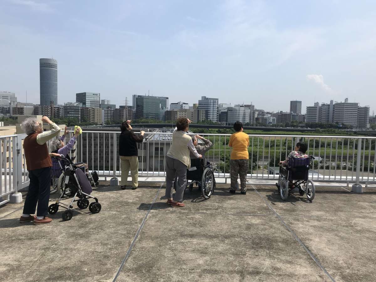 春・秋の暖かい日は、昼食後に皆さんで屋上へお散歩。外の新鮮な空気と眺めを満喫していただいております!