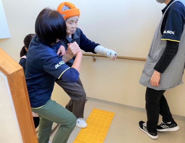 また、停電によりエレベーターが使用できないことももちろん想定されますので、車椅子の方を階段で上る訓練もします!