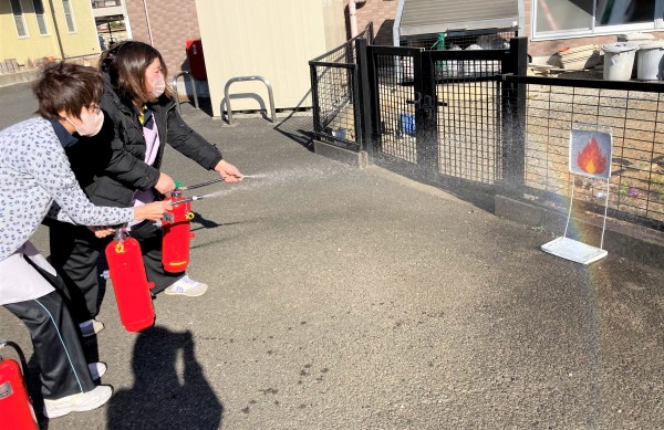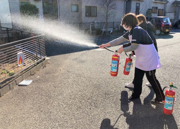 冬は空気が乾燥し、かつ風が強いため、火が燃え広がりやすい時期ですので火事の際はしっかり落ち着いて消火活動が行えるよう、年2回しっかりと訓練します☆