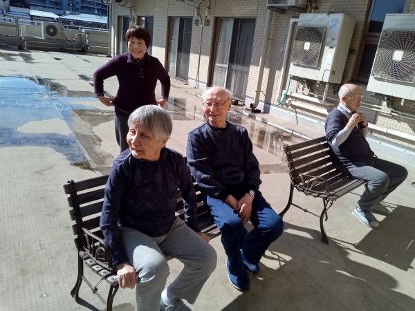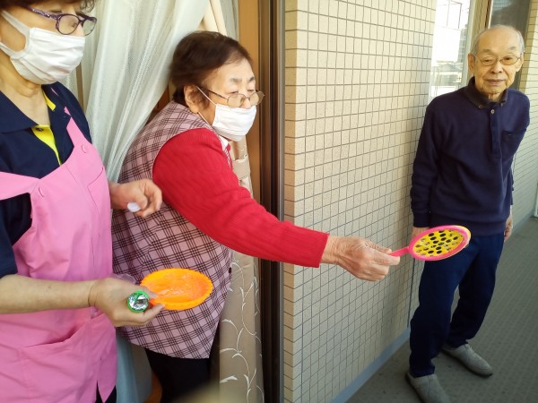 先日、午前のティータイムの後にベランダにてシャボン玉を飛ばしました♪吹くタイプではなく、穴の空いた小さなラケットのようなものを使いました!大きいシャボン玉や一度にたくさんの玉がつくれる形です♪意外と慣れないと使いこなすのが難しく、華麗な手さばきで何度も挑戦される方も居て、きれいな形が作れた時には歓声が上がりましたね♪日光浴も兼ねて、楽しんで頂けたようです♪