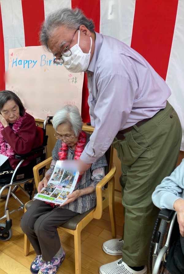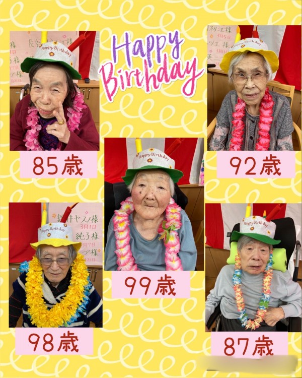先日の百寿の祝いの日に3月の誕生日会を行いました。3月は100才の方を含めて6名の方が誕生日を迎えられます。