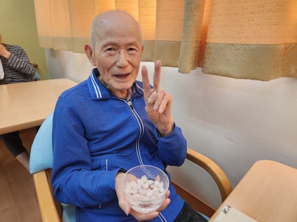 風になびく桜の花びらがちょうど入居者様の頭の上に落ちてきて、髪飾りのようにつけて写真を撮ってみました☆