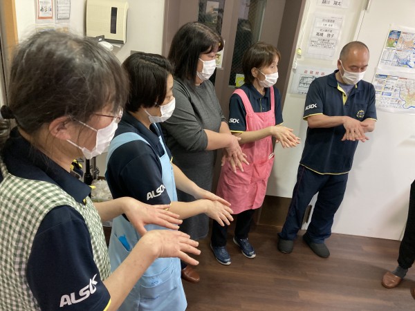 ブラックライトをあてて、洗い残しが無いかの確認です。きちんと洗ったつもりでも、やはり爪の間に汚れが残っている事が分かります。手首も忘れがちなようです。「爪の汚れは爪ブラシで落とさないとかな?」と話していると、講師の方から「今は爪ブラシでかえって傷をつけてしまう場合があるので、推奨はしていないんです。。」との事でした。爪を掌にこすり付け丁寧に洗うのが良いそうです。『そーなんですね』と頷くスタッフ一同。勉強になりました。