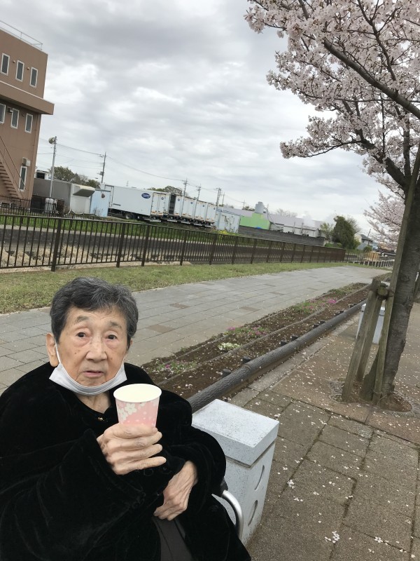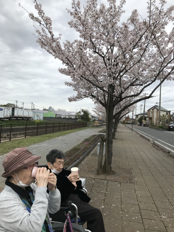 桜を見ながら、お茶とおやつを食べました(^^♪
