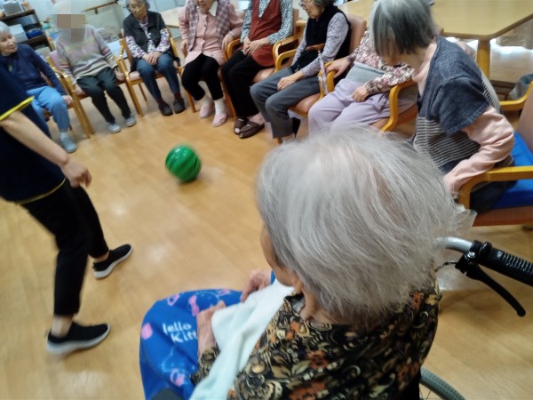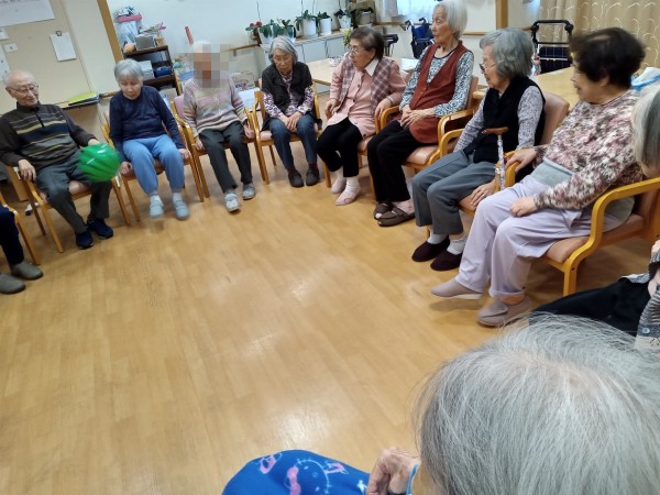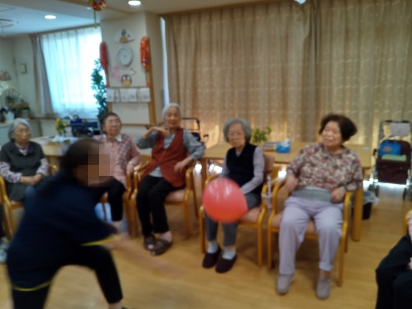 体操の後に、「ビーチボールサッカー」と「風船バレーボール」を行いました!職員が間に入ってサポートしながら遊んで頂きました♪この日も盛り上がりましたね!レクのアイデアも随時募集しております♪