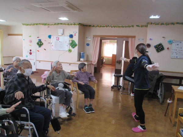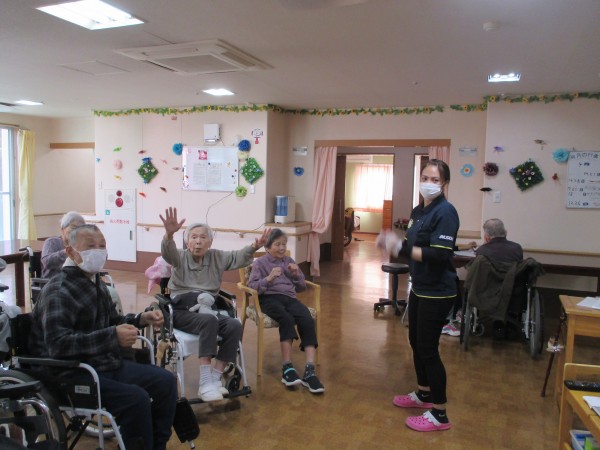 音楽に合わせて、手・足の運動を行いました!!!体操が終わった後、「体を動かすと、やっぱり気持ちいな~」と仰っていました(^^♪。皆さん、いきいきと体操されました(^^♪。