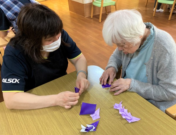 今月は、ご入居者様と一緒に【藤の花】作りを行います!
