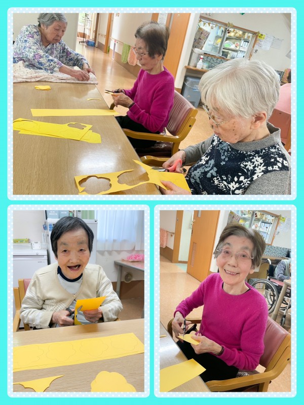 利用者様にお花紙を蛇腹に折って頂きM子様とK様が花をめくってくれました。
