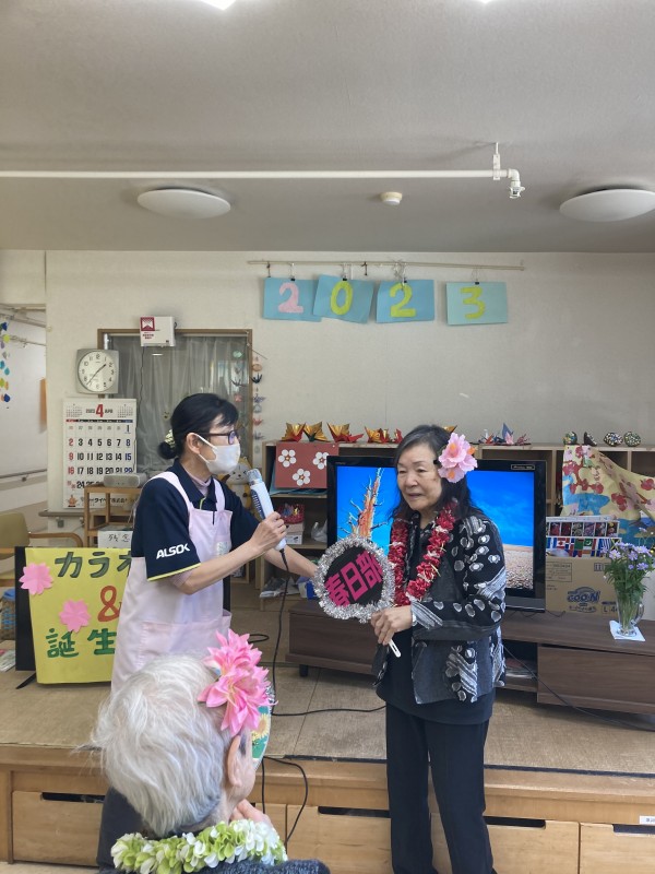 レイに髪飾りに華やかにカラオケ大会が始まりました。