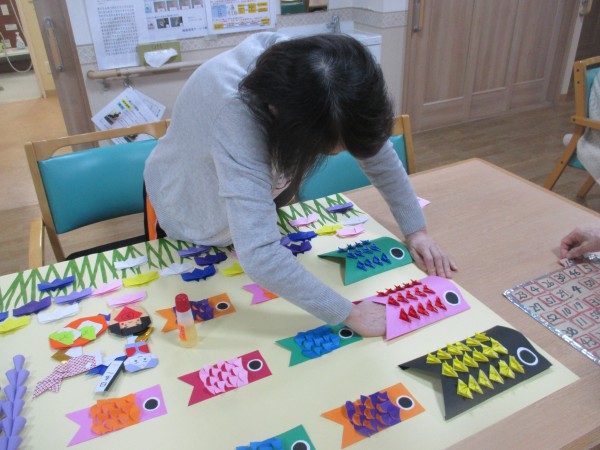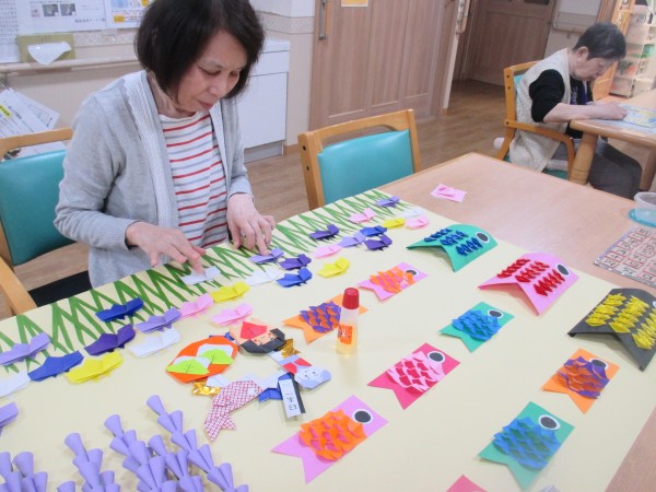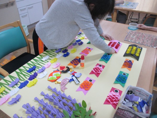 鯉のぼりやふじの花を色紙で作り、飾られています。