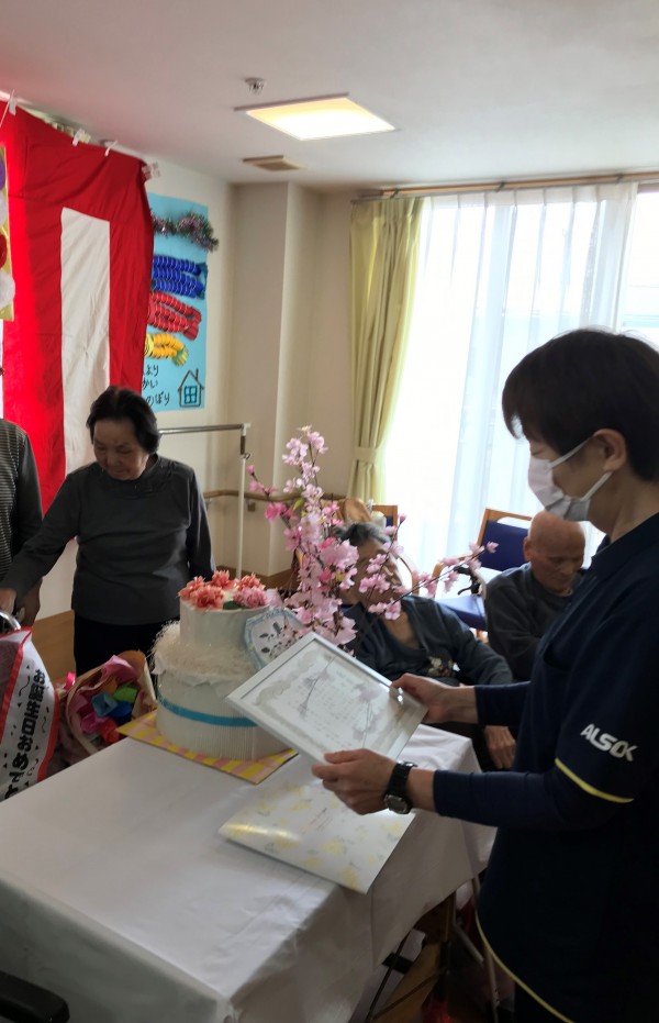 先日、100歳を迎えられた方がおり、感謝状の贈呈とスタッフ総出での記念撮影が行われましたっ(*^-^*)