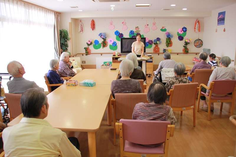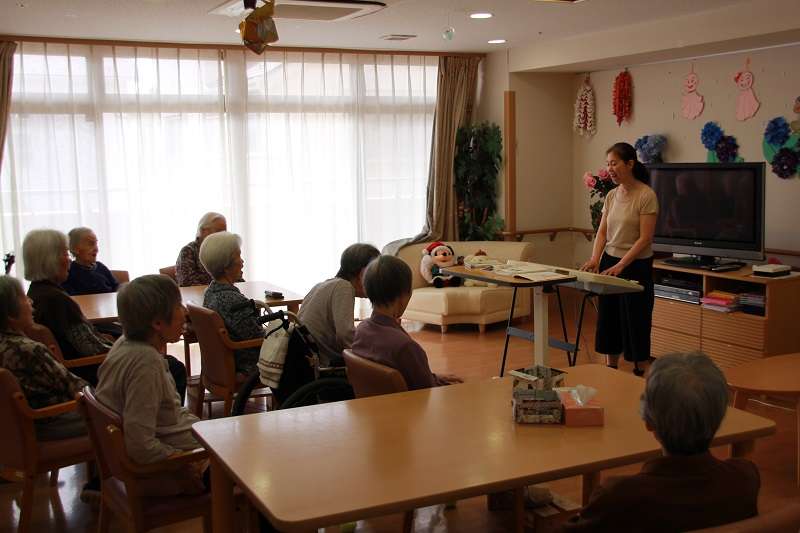 口腔体操を行い、季節の童謡や唱歌、懐メロを合唱します。