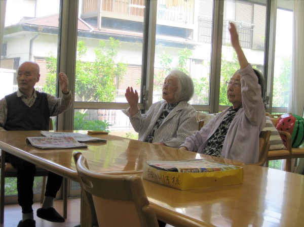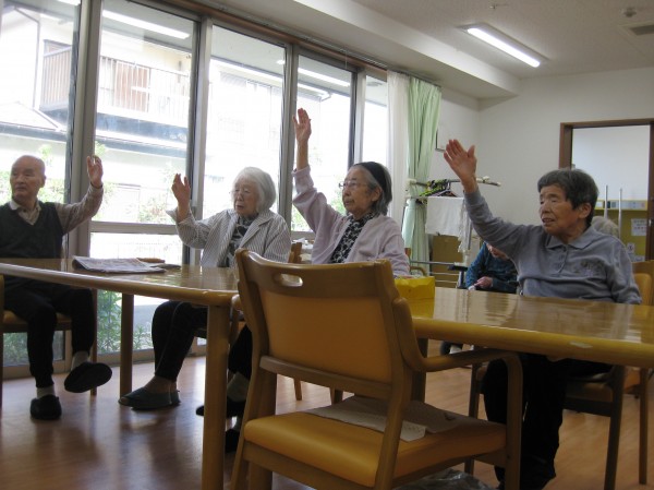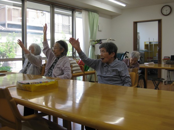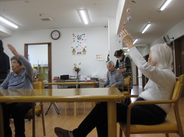 みなさま、ビデオを見ながら元気にALSOK体操に参加されています( ^ω^)・・・ 手を高く上げられたり足を動かしたりと脳が活性されたようですね(^^♪ 職員さんも頑張っていますね!(^^)!