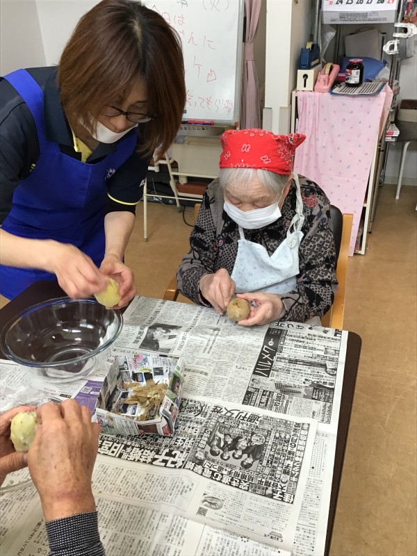 皮をむいたじゃがいもは麺棒で潰して下さっていますが、お一人がボウルを支えてもうお一人がじゃがいもを潰して下さいます。