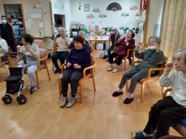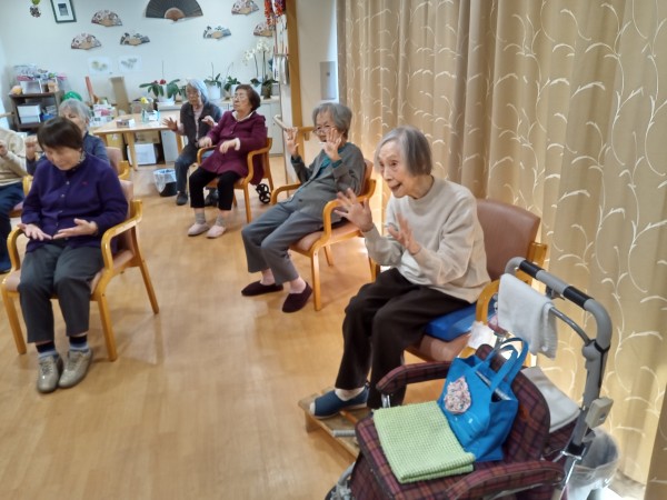 立ち上がり時の転倒予防と、身体を守るための反応力を鍛える手の曲げ伸ばしや、脳を目覚めさせたり手足の冷えを取り血行をよくするための手を叩く運動、食べこぼし防止の為の口の筋肉を鍛える運動などを行いました!