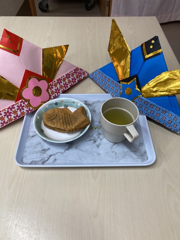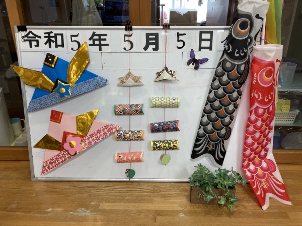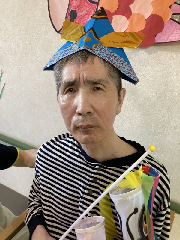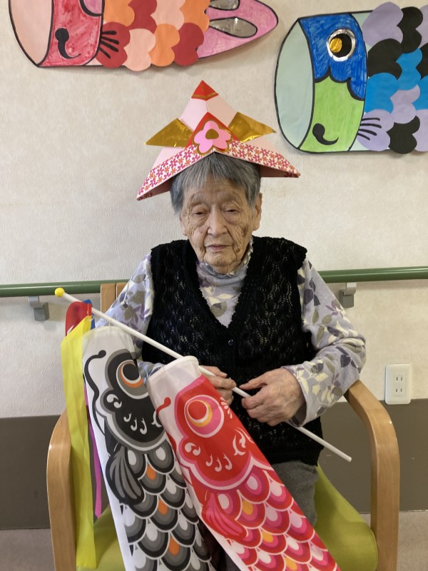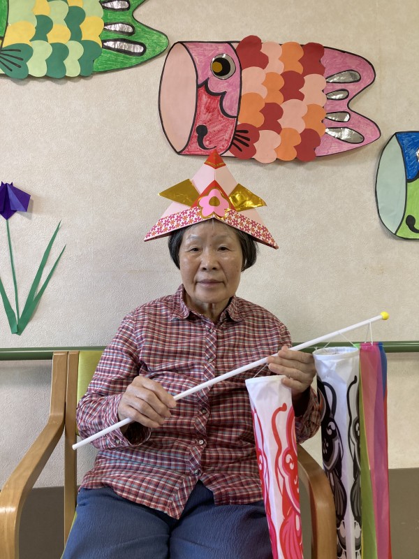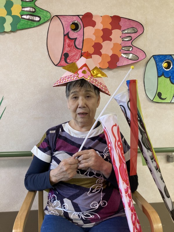スタッフの手作り兜に鯉のぼりで記念撮影です。