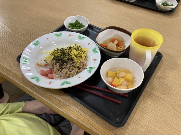 献立は、まぐろそぼろちらし寿司、さつま揚げと大根の煮物、うぐいす豆、フルーツミックスです。