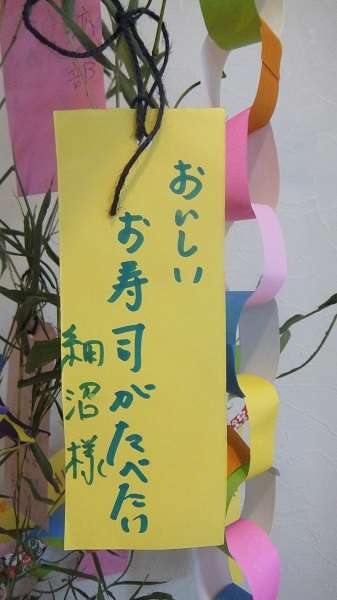 今日は1階利用者様の願いが込められた短冊を笹の葉に結びました。