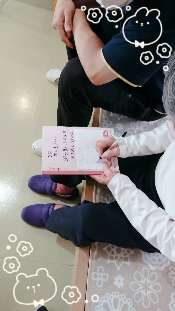 いつもは不穏になりがちな利用者様がスタッフと並んで座って...
