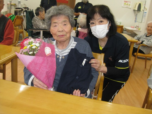 息子様から母の日プレゼントです。これから着られるようなカーディガンとお花をお持ちになられました( ^ω^)・・・ 「来てくれたんだ? 持って来てくれたの?」と嬉しそうにお話しされていました!(^^)! これは何のお花かな? カーネーションのだね! 綺麗だね(^^♪ 持って来られるなんっていい息子さんじゃない?とみんなでお喋りされていました( ^)o(^ ) 母の日プレゼントに盛り上がり楽しそうでした!!