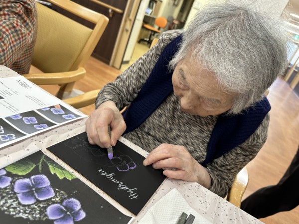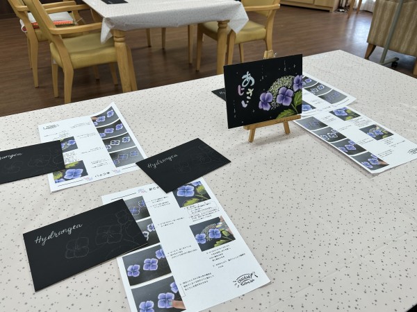 自由に描くのはかなり高度な技が必要なので、先生が季節に合わせて「あじさい」の下描きを描いてきて下さいました☆☆