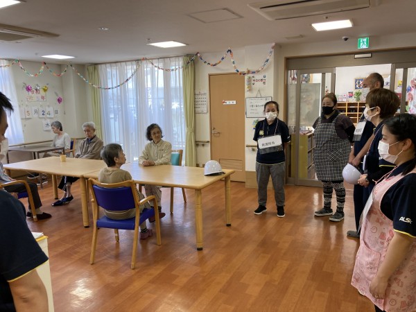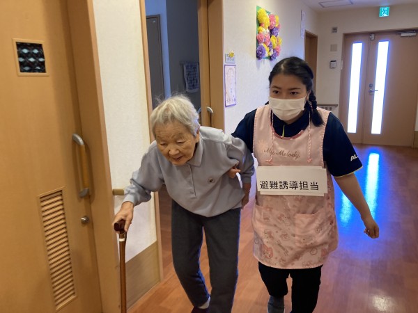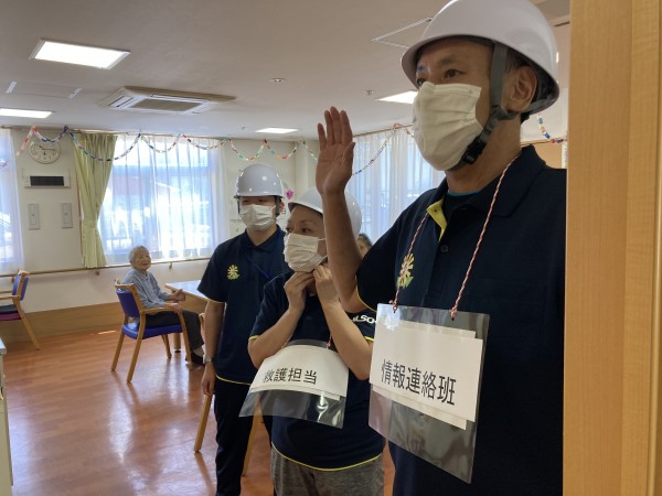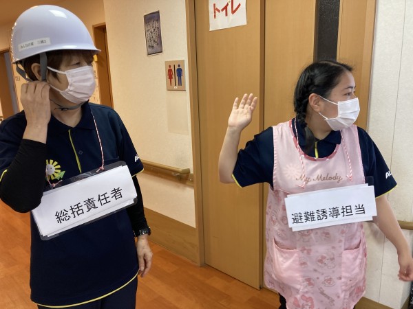 災害アラームを鳴らし30秒後に地震発生、揺れが落ち着いたらご利用者様の避難誘導を行います。