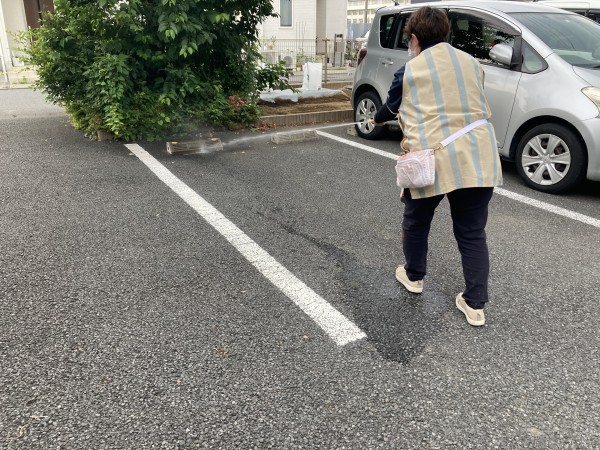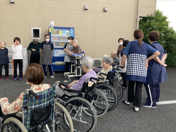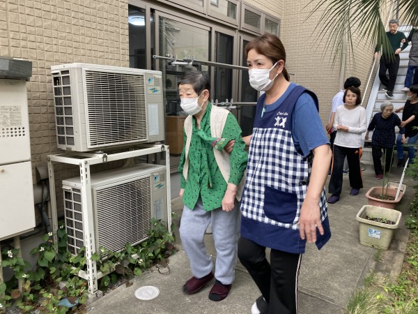 職位の通報訓練から始まり、ご利用者様は避難口、避難階段を使って駐車場まで避難していただきました。
