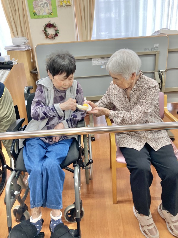 小さな球を、れんげに乗せて隣の方へ繋げていました。