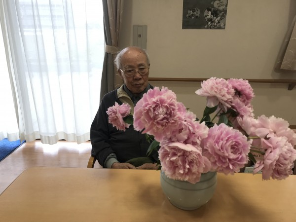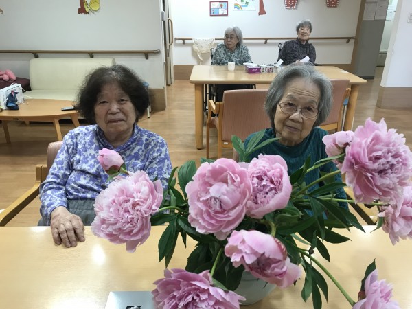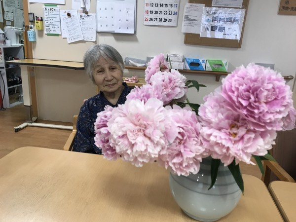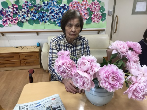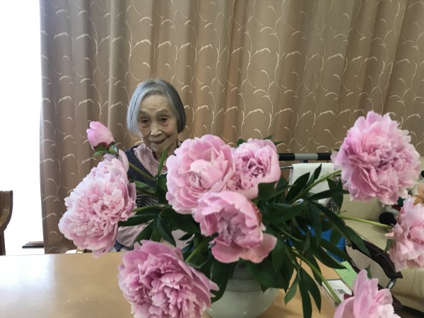 シャクヤクの花がホームに届き、蕾だった花も翌日には満開になりました♪大ぶりなお花に皆様「すごいわね~」「綺麗ね~」と感嘆の声を上げられました!香りも良かったですね!お花とのショットで素敵な表情が撮れました♪