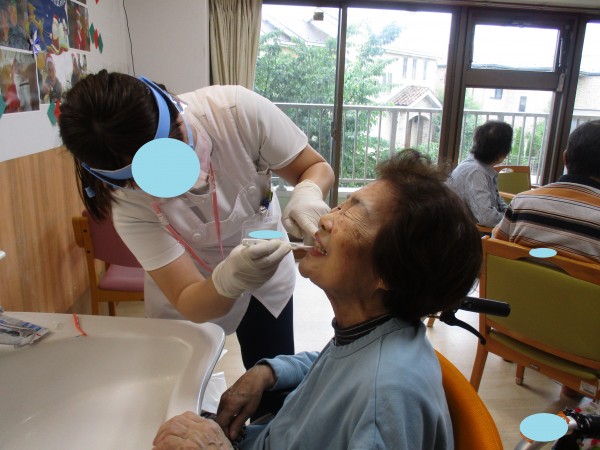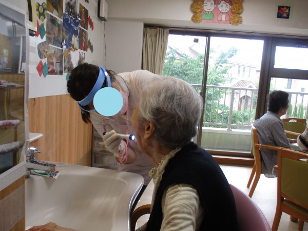 お口の中を丁寧に、、、残渣物、歯茎の腫れ、入れ歯の具合などを診ていただいています。