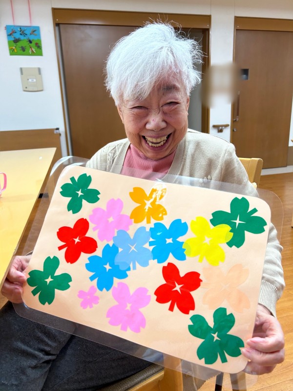 ①画用紙の色を選ぶ ②貼る柄を3種類(朝顔、四つ葉、桜)から1つ選ぶ ③貼る配置を考える ④ノリで貼る