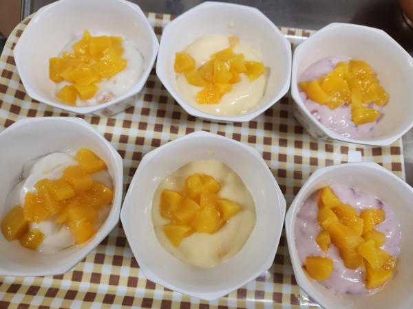 用意した味は3種類で、桃・マンゴー・イチゴ!トッピングに桃をのせました☆