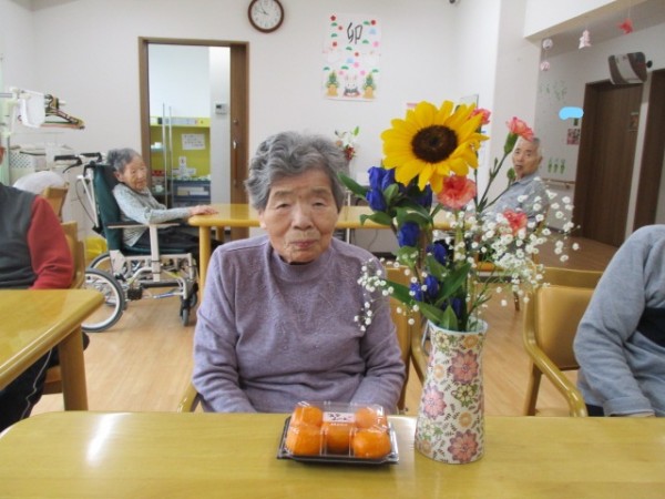 お花とおみかんをお持ちくださりました!! ひまわりやりんどうのお花綺麗ねとみなさんでお話しされていました・・・///