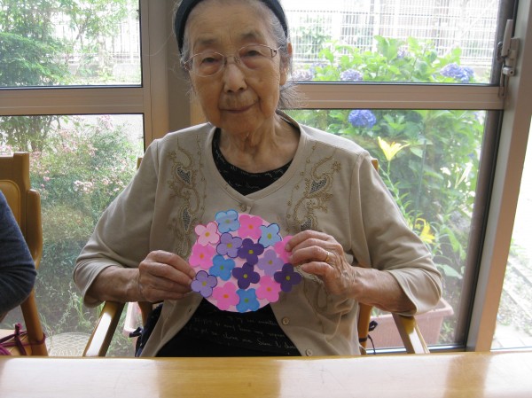 個々に紫陽花の花の貼り絵を行いました( ^ω^)・・・