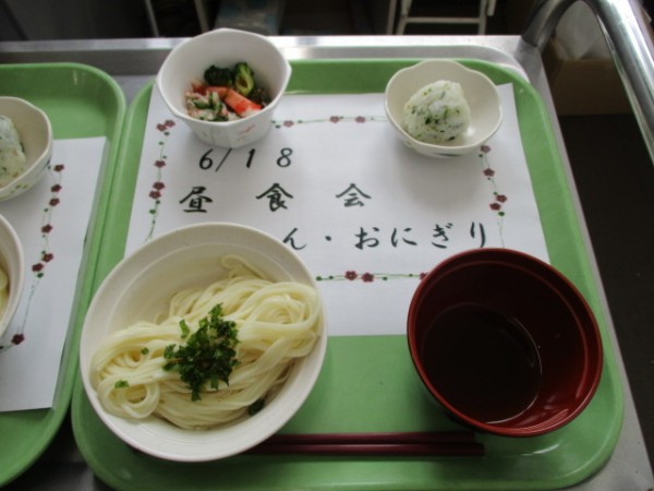 2階で昼食会を行いました( ^ω^)・・・ そうめん・おにぎり・かにかまサラダのメニューです。