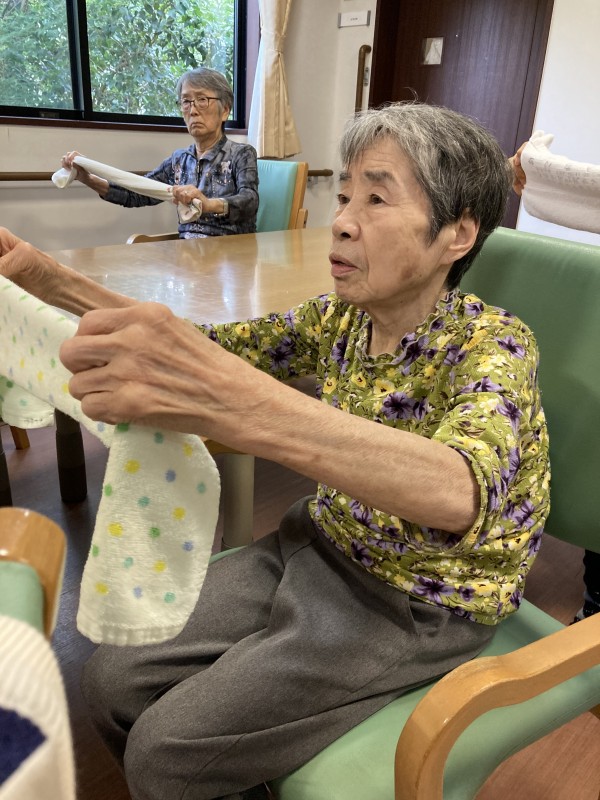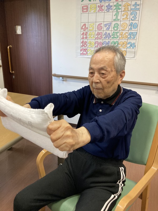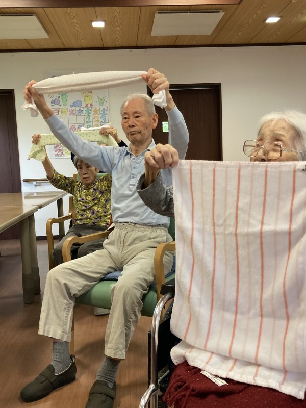 タオルを使った体操を行っている様子ですが、入居者様は器用にタオルを使って上手に体操をされていました