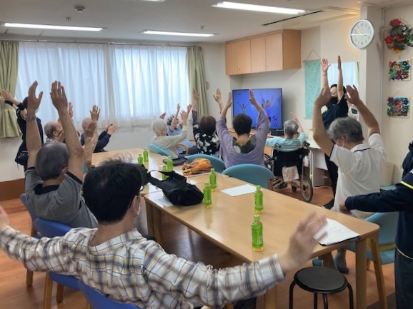 ♪新しい朝が来た、希望の朝だ・・・♪と、ラジオ体操の歌をご利用者様が歌われて体操が始まりました。