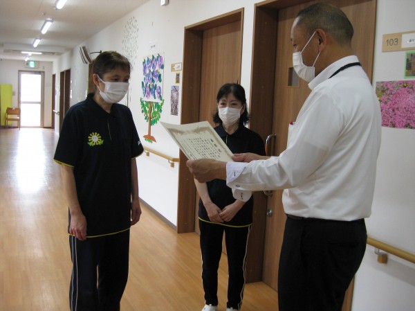 こんにちは! グループホームみんなの家・あきがせの介護ブログです! よろしくお願いいたします。 今日は5年勤続表彰を行いました。そのご様子をお知らせいたします!