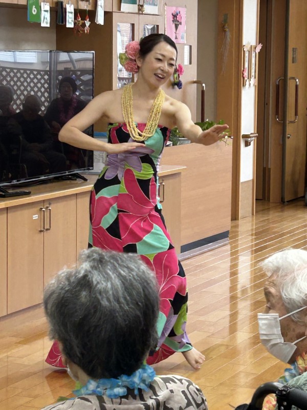 曲に合わせて手拍子をする方、手を動かして一緒に踊る方、涙ぐまれる方、可愛いフラガールに目を細め笑顔になられる方。はたまた素敵なフラガールに釘付けになる男性利用者様(笑)とても楽しい時間となりました。
